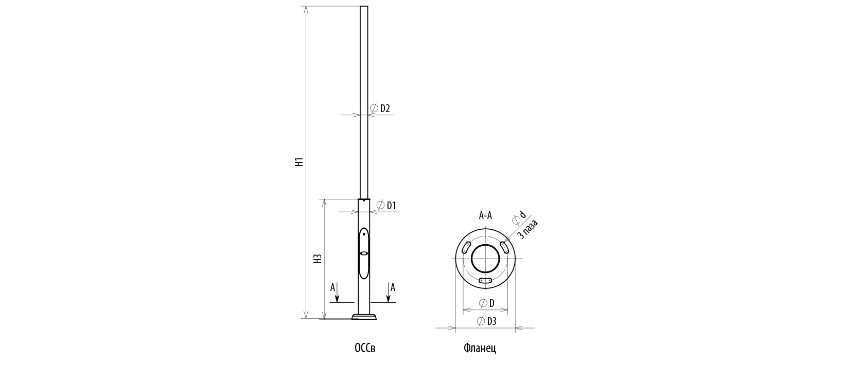 Конструктивно опора ОССв являются сварной ступенчатой конструкцией из двух стальных труб и отсутствием видимых сварных швов. Монтажный лючок выполнен заподлицо. Внутри опоры расположены планки для монтажа электрооборудования и планка для заземления