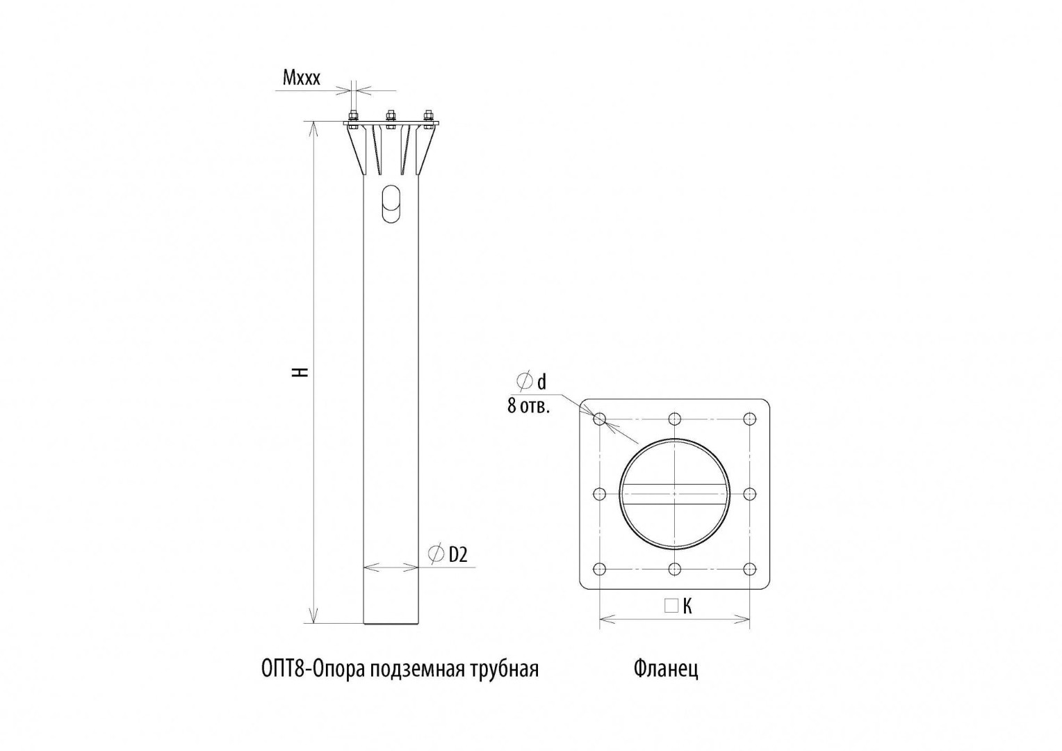 | Обозначение | Наименование | Высота H, м | Диаметр трубы D2, мм | Размер опорного фланца К, мм | Размер крепежного отверстия Ød, мм | Количество отверстий, шт | Крепежный комплект |