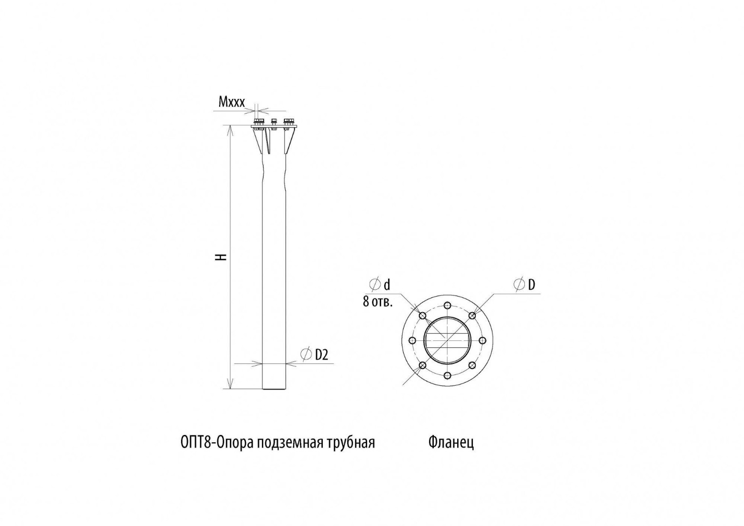| Обозначение | Наименование | Высота H, м | Диаметр трубы D2, мм | Размер опорного фланца D, мм | Размер крепежного отверстия Ød, мм | Количество отверстий, шт | Крепежный комплект | Для каких опор |
